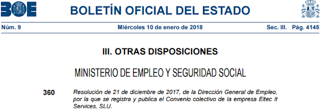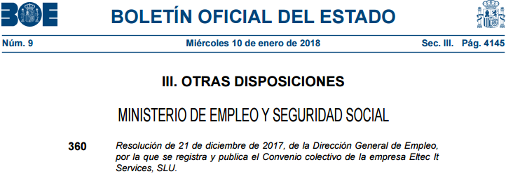 El pasado 10 de enero se publicó en el BOE el nuevo Convenio colectivo de Eltec IT Services, firmado el 26 de octubre de 2017 por la empresa y las secciones sindicales de USO y CCOO.